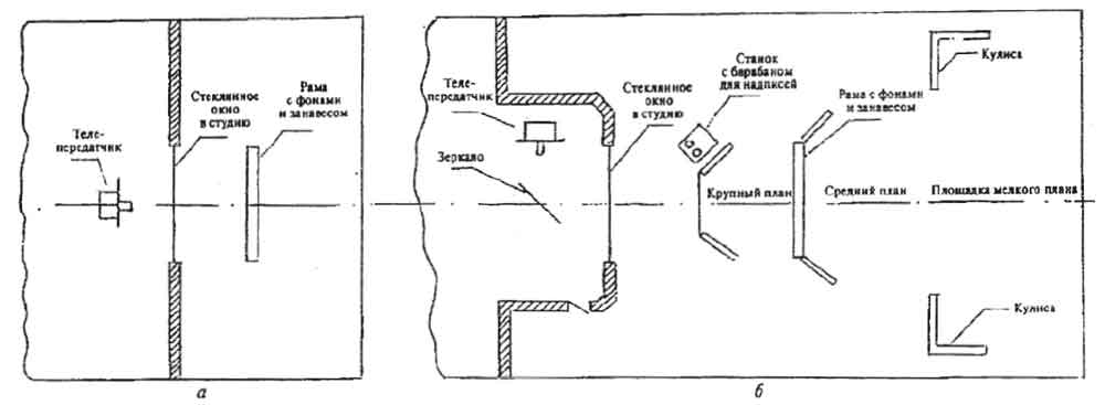 Рис. 2. План размещения телепередатчика бегущего луча (а) и прямого видения (б) при передачах из студии