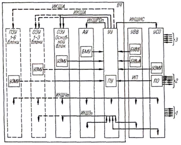 ВЧ — вычислительная часть; АУ — арифметическое устройство; ОЗУ — оперативное запоминающее устройство; ПЗУ — пассивное запоминающее устройство; УУ — устройство управления; ИКША — импульсные кодовые шины адреса; ИКШНС — импульсные кодовые шины номера сигнала; ИП — импульсные кодовые шины пульта; УСО — устройство связи с объектом и оператором; ПО — пульт оператора; УВВ — устройство ввода и вывода; БУВыв — блок управления выводом; ИКШРОп — импульсные кодовые шины регистра операций; УЗМУ — блок местного управления ОЗУ, ПЗУ и УСО; БМУ — блок местного управления АУ; ИКШЧт — импульсные кодовые шины чтения; ИКШЗп — импульсные кодовые шины запоминания.