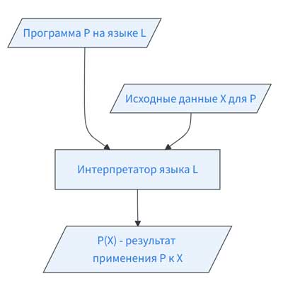 Известно, что языки программирования можно реализовывать как с помощью компиляторов, так и с помощью интерпретаторов. Пусть у нас есть язык L. Тогда интерпретатор - это программа, которая берет программу P на языке L, берет исходные данные X для программы P и вырабатывает P(X) = I(P,X) - результат применения интерпретатора I к программе P и исходным данным X.
