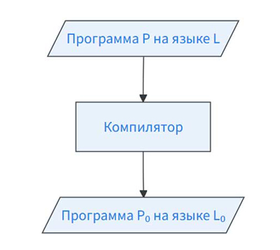 Теперь, пусть у нас имеется компилятор C с языка L на язык L₀, то есть программа, которая текст на языке L преобразует в текст на языке L₀: P₀ = C(P).