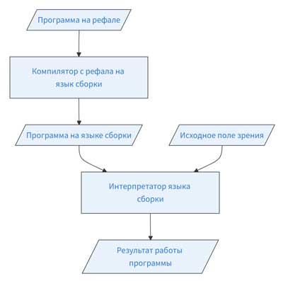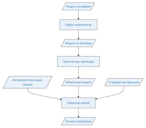 Сначала вызывается рефал-компилятор. На вход ему подается программа на рефале. Он переводит ее на язык сборки. Однако, язык сборки нужно представить в таком виде, чтобы его “понял” интерпретатор языка сборки. Поэтому программа на языке сборки превращается в набор констант на автокоде БЕМШ. Таким образом, конечным продуктом рефал-компилятора является модуль на автокоде БЕМШ.