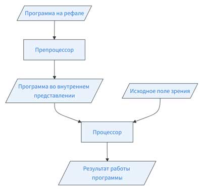 Полезно сравнить это с рефал-интерпретатором. Интерпретатор, описанный в [1, 2], состоит из двух основных блоков: процессора и препроцессора. Препроцессор производит предварительный анализ рефал-предложений: определяет порядок отождествления, классифицирует переменные выражений на открытые и закрытые, заменяет индексы переменных на адреса, указывающие на отведенные для них места в таблицах и т.д. Таким образом, препроцессор переводит исходные предложения рефала на некоторый особый, внутренний язык, который затем непосредственно интерпретируется процессором. Таким образом, общая структура интерпретатора такова: