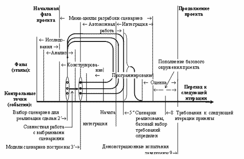 - Для каждого из сценариев образуется мини-цикл его разработки. Разработка мини-циклов включает в себя перекрывающиеся этапы автономной работы и интеграции сценариев (контрольные точки 3?, 5?? и 5?, 7).