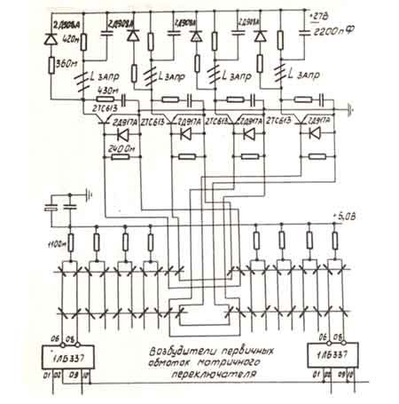 Импульсы тока запрета формировались с помощью токоограничивающего сопротивления и сильноточного интегрированного транзистора 2ТС613Б, коллектор которого соединен с обмоткой запрета, а база была подключена параллельно выходной обмотке матричного переключателя на 4 выхода. Матричный переключатель выполнен по схеме суммирования выходной мощности микросхем 1ЛБ337, причем количество суммируемых переключателем токов – 4, а суммируемых напряжений – 2, коэффициент трансформации 1:2. Количество обмоток запрета – 4, из них выбирается в рабочем цикле не более одной. Поэтому использование транзисторов интегрированной матрицы весьма эффективно.