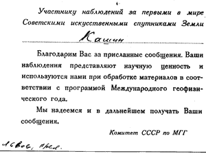 В адрес "Москва - Спутник" (таков был почтовый адрес специального Комитета при АH СССР, созданного в рамках МГГ - Комитет СССР по МГГ) поступили многие тысячи донесений (записи радиосигналов на магнитную ленту, измерения напряженности поля, регистрация времени слышимости и характера радиосигналов) из более чем трехсот населенных пунктов (радиоклубы ДОСААФ и индивидуальные ЛРС), расположенных в самых различных районах СССР. Hаблюдали за работой спутника в Антарктиде (станция "Мирный" - UA1KAE) и на Северном полюсе (станция "СП-6").