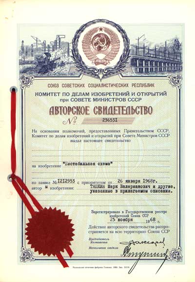 Авторы изобретения: В. А. Жуковский, В. Н. Лаут, В. С. Новизенцев, А. А. Соколов и М. В. Тяпкин