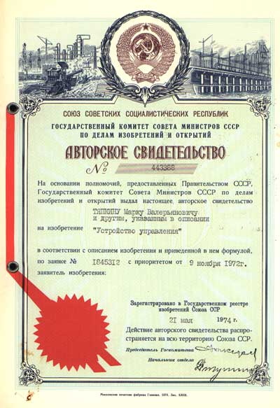 Авторы изобретения: В. А. Жуковский, В. Н. Лаут, А. А. Соколов и М. В. Тяпкин