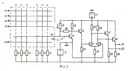 Благодаря наличию глубокой отрицательной обратной связи через резистор 18 транзкстор 15 всегда находится в линейном режиме (в активной области), при этом входное сопротивление схемы в точке «а» (фиг. 2) мало (порядка нескольких Ом), а коэффициент усиления полностью определяется резистором 18 обратной связи, следовательно при изменении входного тока (тока в шине 14) потенциал базы транзистора 15 практически не меняется.