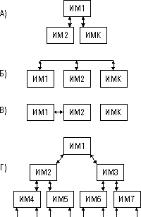 В процессе решения задачи или одновременно нескольких задач архитектура МДА динамически изменяется не только на уровне автоматов, но и на уровне вычислительных модулей. Так, при выполнении операторов 1, 2 или 4, 5 МДА имеет структуру, приведенную на рис. 5, а. Такую же структуру машина имеет при решении систем линейных алгебраических уравнений одним из итерационных способов. При выполнении операторов 3 и 6 в МДА реализуется полный граф связей (рис. 5, б). При решении дифференциальных уравнений в частных производных в МДА формируется линейная структура (рис. 5, в), а при решении задач, связанных с перебором вариантов, – древовидная (рис. 5, г).