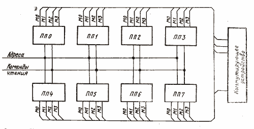 Упрощённая блок-схема организации постоянной памяти ЭВМ М-10 показана на рис. 1 и состоит из 8 отдельных устройств ПП0 — ПП7, являющихся функционально законченными устройствами памяти с информационной емкостью 64 кбайт. Каждое из них конструктивно оформлено в виде отдельного шкафа и имеет самостоятельные схемы организации считывания информации, аппаратного контроля и защиты цепей питания.