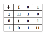 Очень просто выполняется в уравновешенной троичной системе сложение. Составим таблицу сложения, которой будем пользоваться для обычного сложения чисел столбиком: