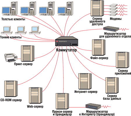 Термин «сервер» толкуют по-разному. Иногда его относят к оборудованию, а иногда — к ПО. В некотором смысле оба этих определения относятся к архитектуре, подготовленной к получению запросов извне и отвечающей на эти запросы путем выдачи информации заданного типа. Разумеется, в обоих случаях ядром системы является соответствующее ПО. Когда об оборудовании говорят как о сервере, обычно имеют в виду, что на нем работает одна или более серверных программ, что он может быть предназначен для той или иной роли и, возможно, состоит из компонентов, обеспечивающих высокую степень готовности. Вообще говоря, слово «сервер» имеет тот же корень, что и «сервис». Таким образом, с точки зрения аппаратных средств сервер — это компьютер, который способен оказывать некоторые услуги другим, подсоединенным к нему компьютерам. Подразумевается, что компьютеры каким-то образом связаны с сервером и друг с другом (рис. 1).